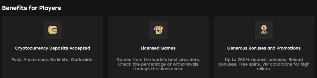 | Staking Benefits | You can “stake” your tokens via the Hold to Earn program to gain passive rewards from the casino’s income. |