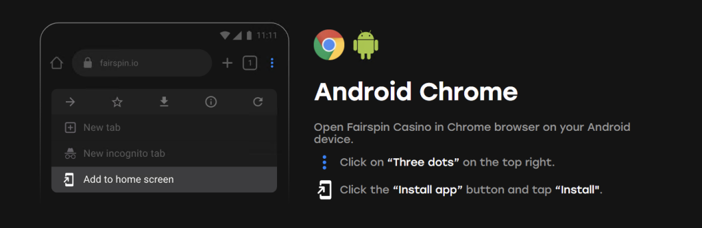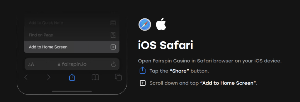 Fairspin utilizes PWA (Progressive Web App) technology. Simply visit the official website on your mobile browser (Safari for iOS or Chrome for Android) and select “Add to Home Screen” from your browser settings.